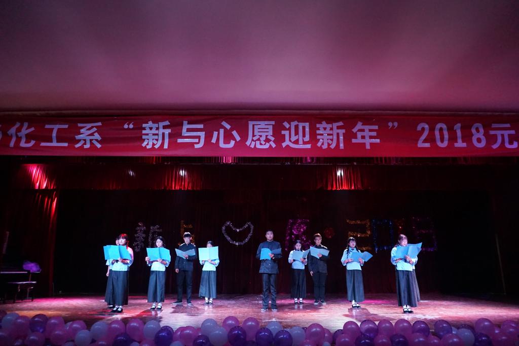在党的十九大精神的感召下,又是一年岁末时,寒风瑟瑟中的冬季校园却在形成着一道道火热靓丽的风景线:各院系的迎新春文艺演出正此起彼伏地进行。为了给这道风景线再添一抹浓重的色彩,从而丰富同学们的课余生活,展现我系2017级学生的新风采、新风貌。12月16日晚6:30,化学与化工系在大学生活动中心举办“新与心愿迎新年”2018元旦晚会,系党政领导、教师、辅导员及全体同学观看了演出。